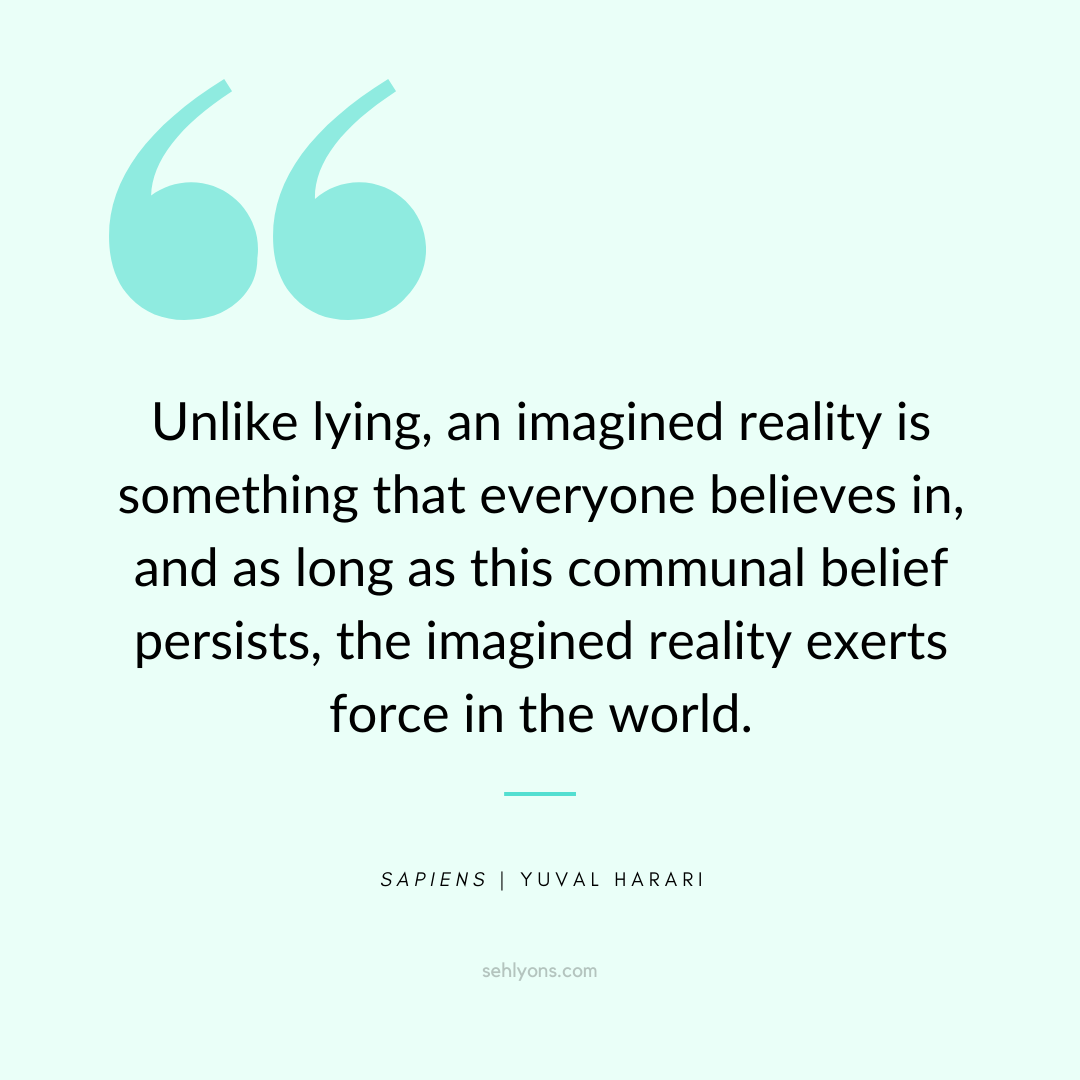 In Sapiens, Yuval Harari argues that the ability to conceive of imagined realities has permitted humans to thrive as a species. Supposedly, we are the only creatures that can communicate in the abstract. We have devised belief systems, supranational organizations, proverbial lines that define one nation from another—collective myths that are intangible yet critical to our survival.